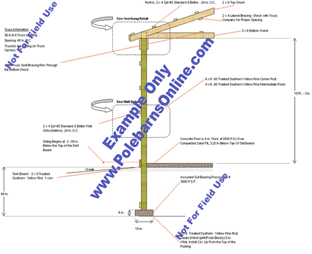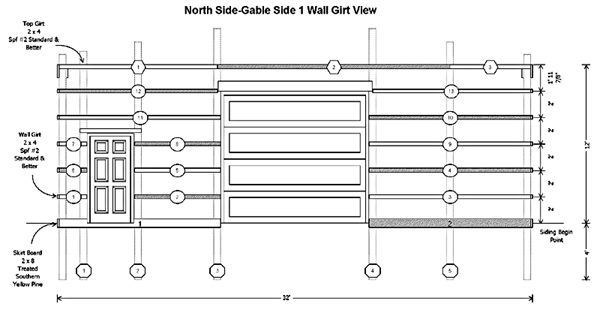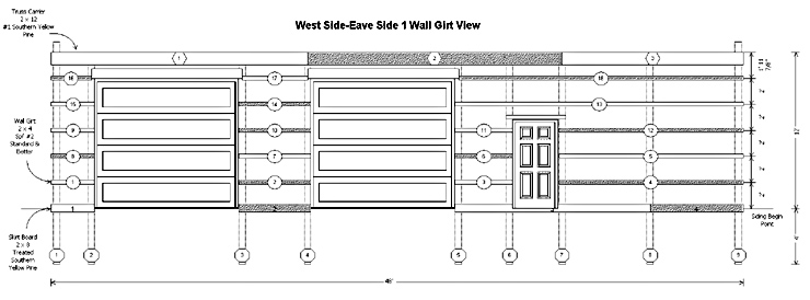 Floor plan or pole layout Labeled cut list Side elevations showing girt, skirt, & truss carrier layout